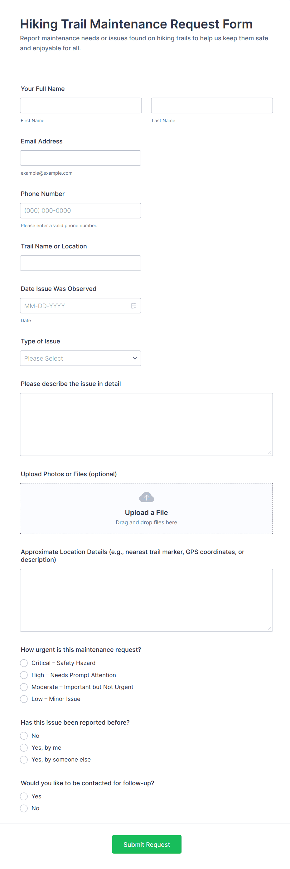 Work request forms are essential tools used by organizations to streamline the process of requesting, tracking, and managing work-related tasks or services. These forms serve as a standardized method for employees, clients, or stakeholders to submit requests for maintenance, IT support, facility repairs, project tasks, equipment needs, or any other service that requires attention from a specific department. By capturing all necessary details upfront, work request forms help ensure that requests are clear, actionable, and prioritized appropriately, reducing miscommunication and delays. Common use cases include internal maintenance requests, IT service tickets, project task assignments, and resource allocation requests.