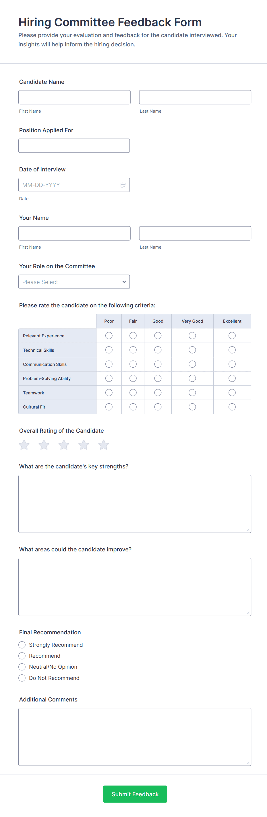 An interview form is a structured document or digital tool used to collect information from individuals during interviews. It standardizes the questions and response formats, ensuring consistency and efficiency in data collection.