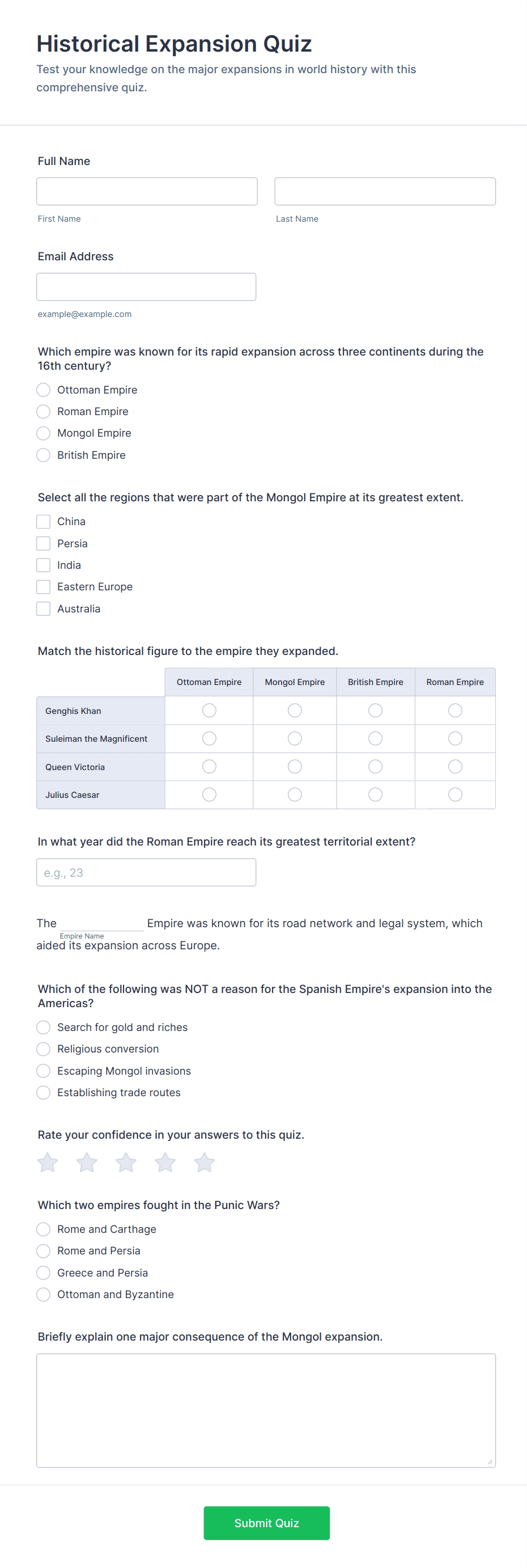 Test students on their history knowledge with this free, customizable online quiz template. No coding. Easy to embed and integrate. Perfect for online classes!