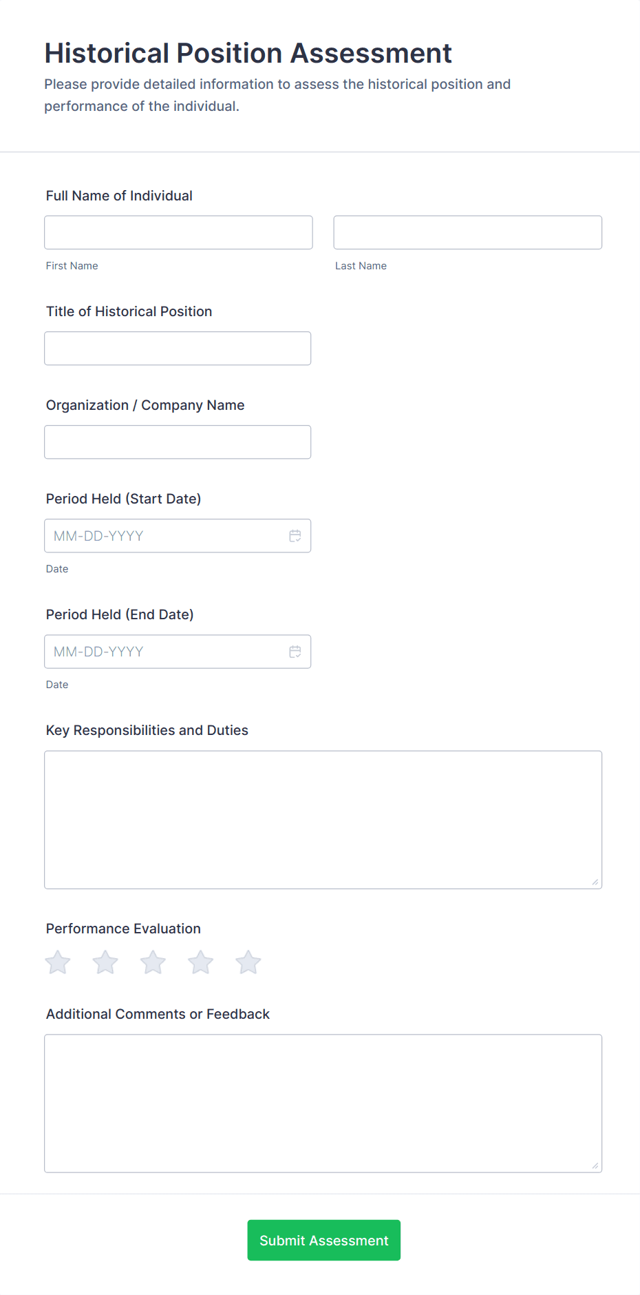 Assessment Form Templates are pre-designed digital forms used to evaluate, measure, or analyze knowledge, skills, performance, or other criteria across a variety of settings. These templates are commonly utilized in education for student assessments, in the workplace for employee evaluations, in healthcare for patient screenings, and in many other fields where structured feedback or data collection is essential. Assessment forms can range from simple quizzes and self-assessments to complex multi-section evaluations, making them versatile tools for gathering actionable insights and supporting decision-making processes.