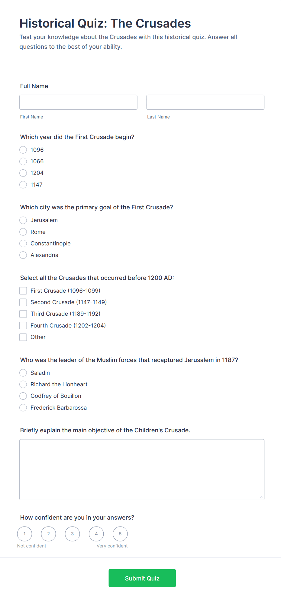 Test students on their history knowledge with this free, customizable online quiz template. No coding. Easy to embed and integrate. Perfect for online classes!