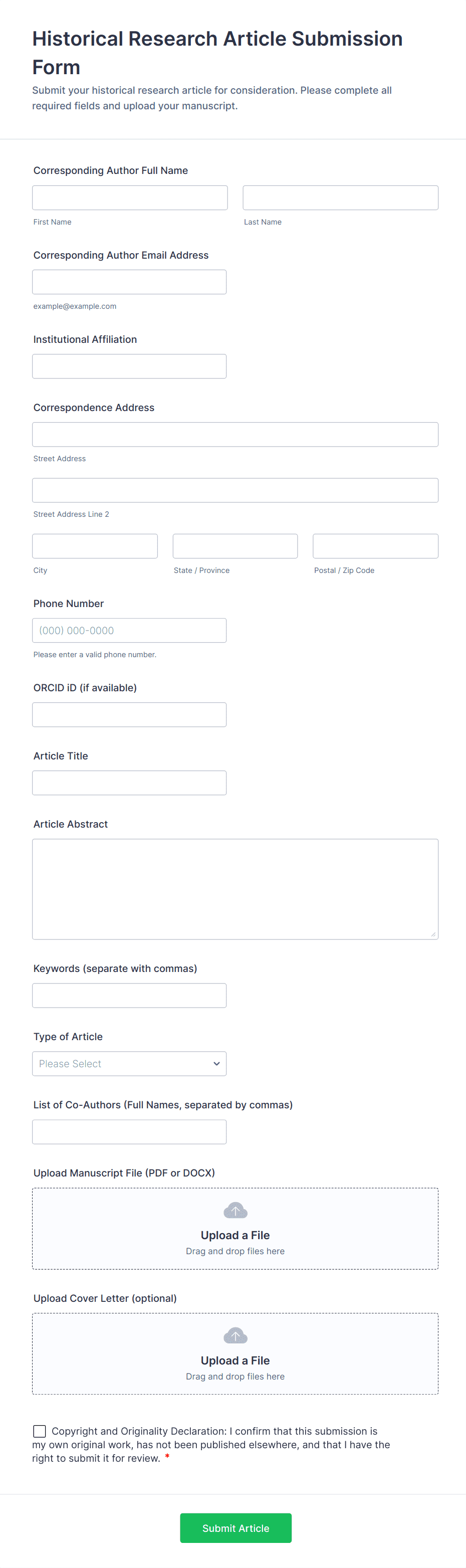 Scientific Research Entry Form allows you to collect research title and abstract information for your journal. Writers can enter their personal information and brief information about their researches, and upload their resumes to your online form.