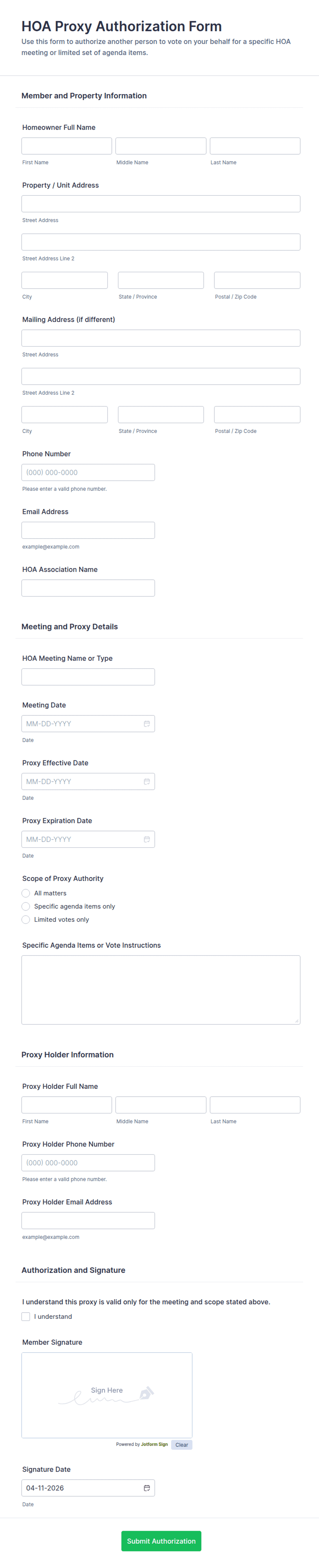 HOA Forms templates in Jotform are ready-to-use digital forms that help homeowners associations collect and manage requests like architectural approvals, maintenance reporting, amenity reservations, and community feedback.