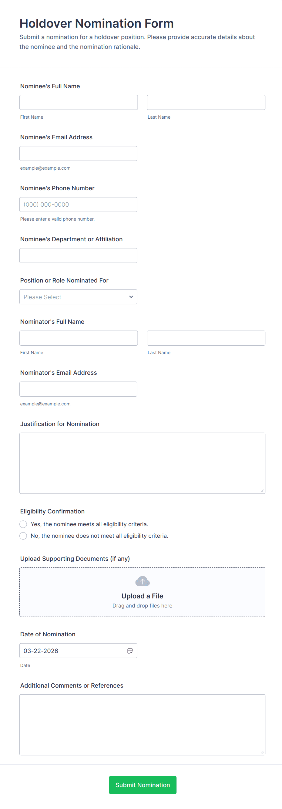 Collect nominee name, role or affiliation, and contact details if needed. Add nominator details and relationship to nominee.
