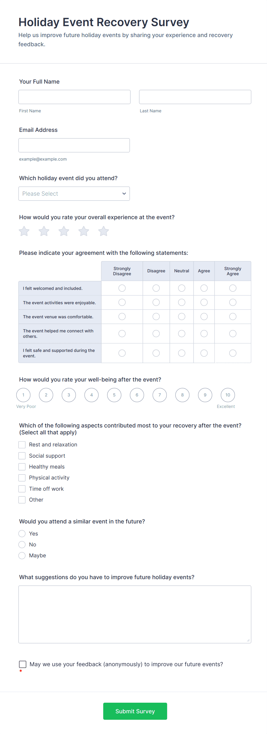 - For virtual events, include questions about technology, accessibility, and online engagement.