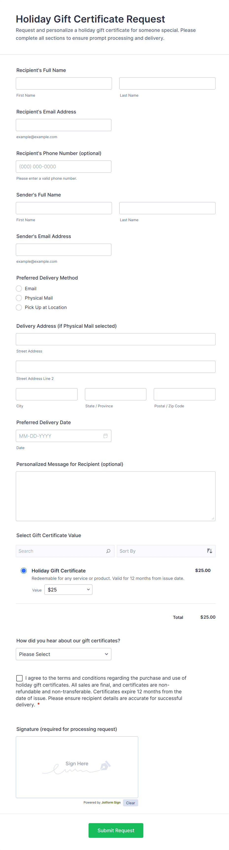 - Holiday order and seasonal request forms prioritize item selection, quantities, delivery or pickup details, payments if needed, and special instructions.