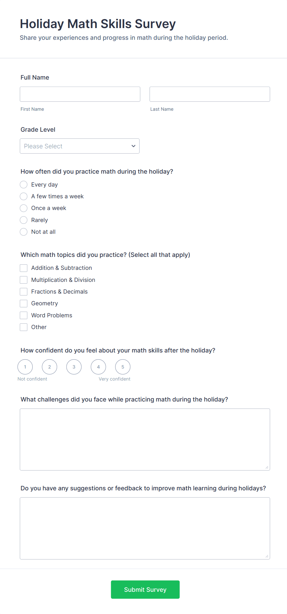 • For parent surveys: Add satisfaction ratings, communication feedback, and suggestions for improvement.