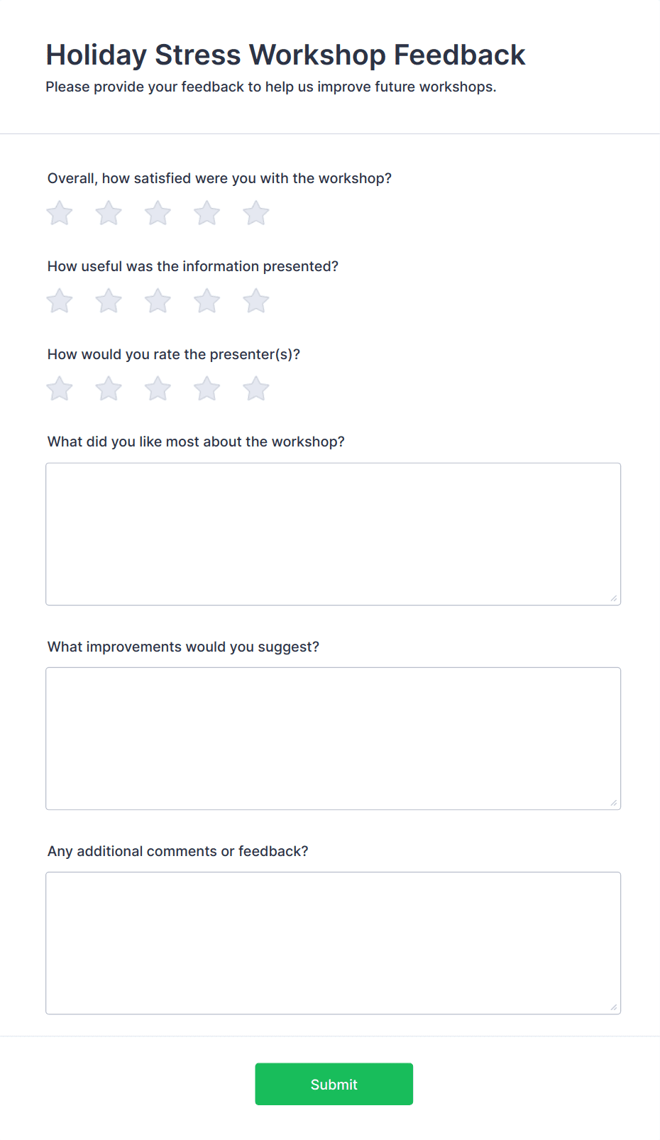 A Virtual Workshop Feedback Form is a customer survey that is used by the organizers of Virtual Workshops to gather feedback from those who attended.