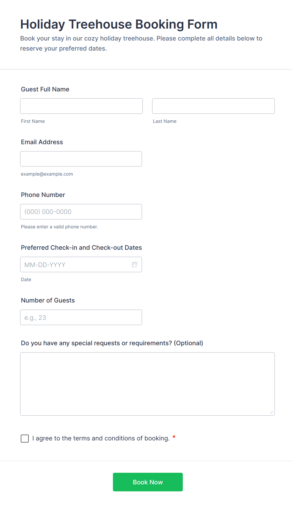 Event Booking Forms are specialized online forms designed to streamline the process of reserving spots, tickets, or services for various events. Whether you’re organizing a conference, workshop, concert, sports tournament, or private party, these forms help collect essential attendee information, manage RSVPs, and process payments or deposits. Event organizers, venues, and service providers use event booking forms to simplify registration, track attendance, and ensure a smooth experience for both hosts and guests. The forms can be tailored to suit different event types, from small gatherings to large-scale public events, making them a versatile tool for anyone managing bookings.