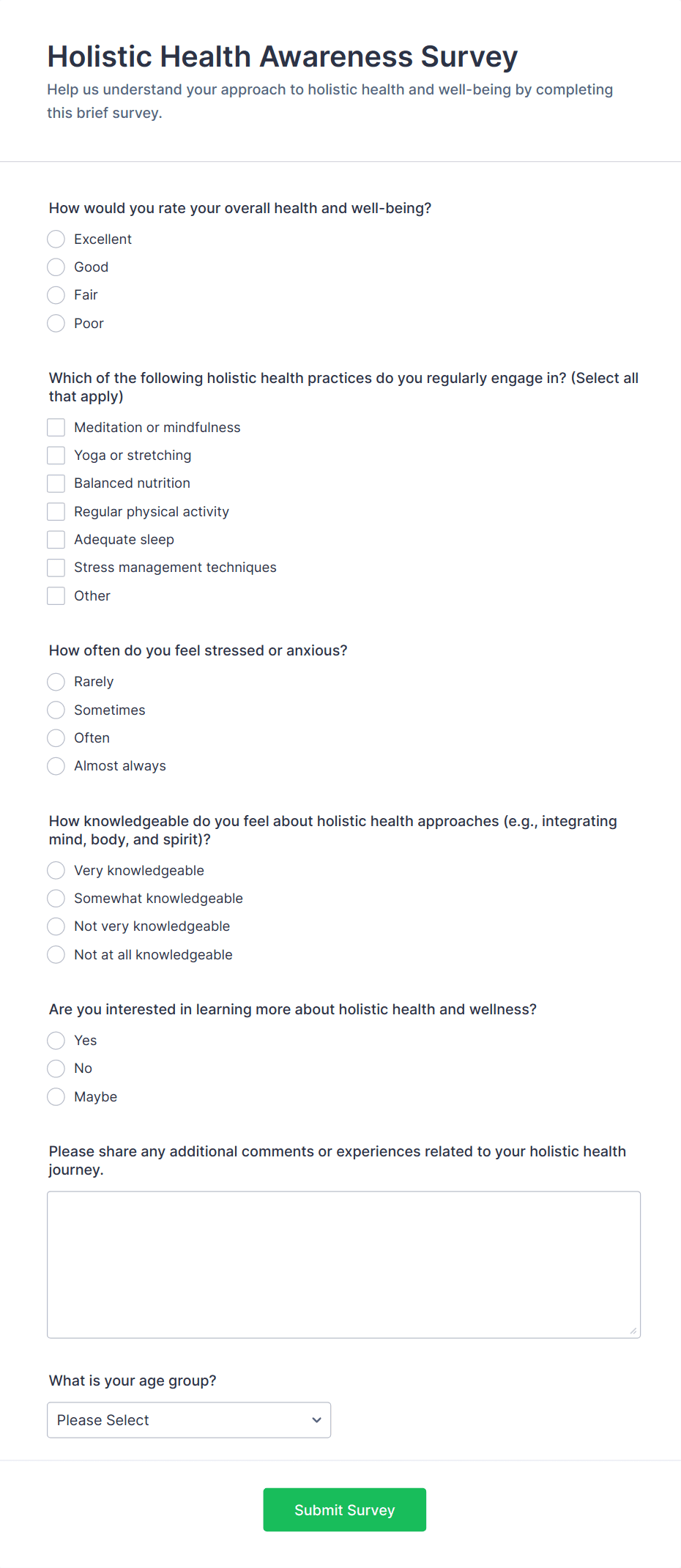 A wellness survey form is a questionnaire used by wellness clinics, health care providers, and health insurers to collect patient health data. Improve the wellness and overall health with Jotform.