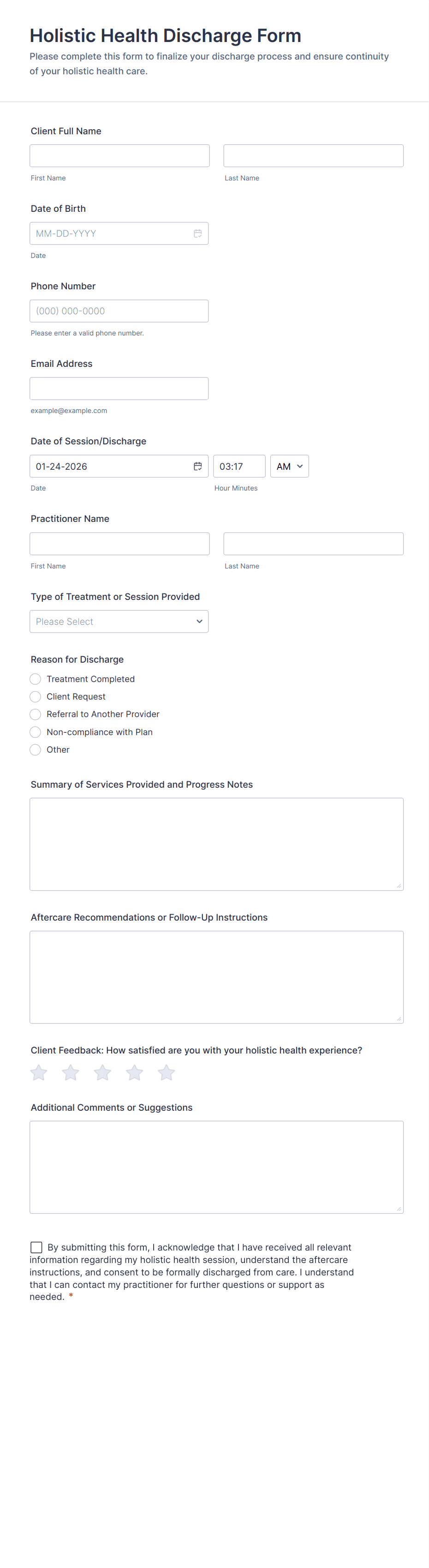 - For a healthcare discharge form, include fields such as patient name, date of discharge, diagnosis, treatment summary, medication instructions, follow-up appointments, and patient acknowledgment.