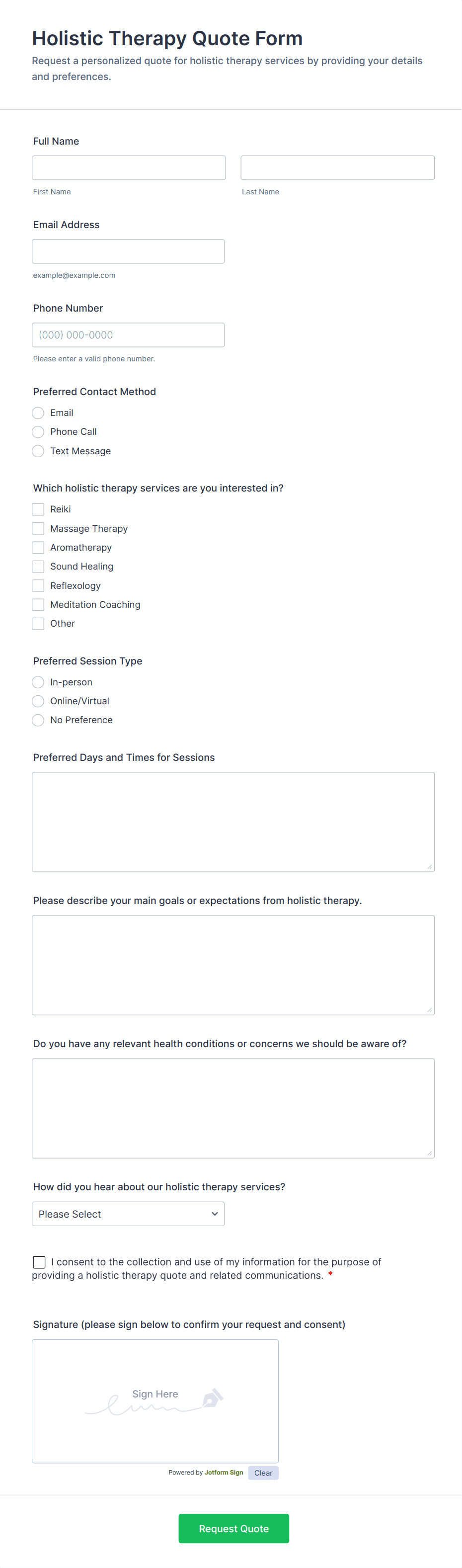 Quote forms are specialized online forms designed to collect information from customers or clients seeking a price estimate for products or services. These forms are commonly used by businesses in industries such as insurance, construction, event planning, logistics, and professional services, where pricing can vary based on specific requirements. By gathering essential details—such as project scope, service preferences, quantities, and contact information—quote forms enable businesses to provide accurate, tailored quotes efficiently. They streamline the initial inquiry process, reduce back-and-forth communication, and help both parties set clear expectations from the outset.