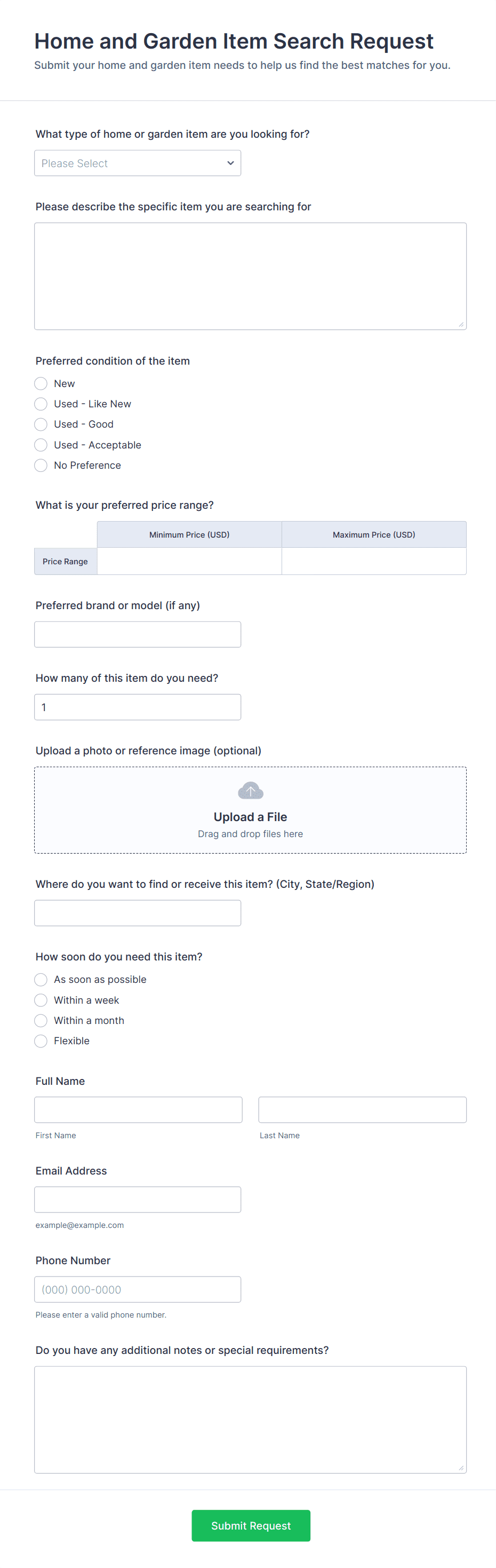 Request forms are essential tools for gathering and organizing information when someone needs to ask for something — whether it’s a service, resource, approval, or support. These forms streamline the process of submitting and managing requests in a wide range of scenarios, such as equipment requests, maintenance requests, time-off requests, IT support, purchase orders, facility bookings, and more. By providing a standardized way to collect all necessary details, request forms help organizations ensure that every request is clear, trackable, and actionable, reducing miscommunication and delays.