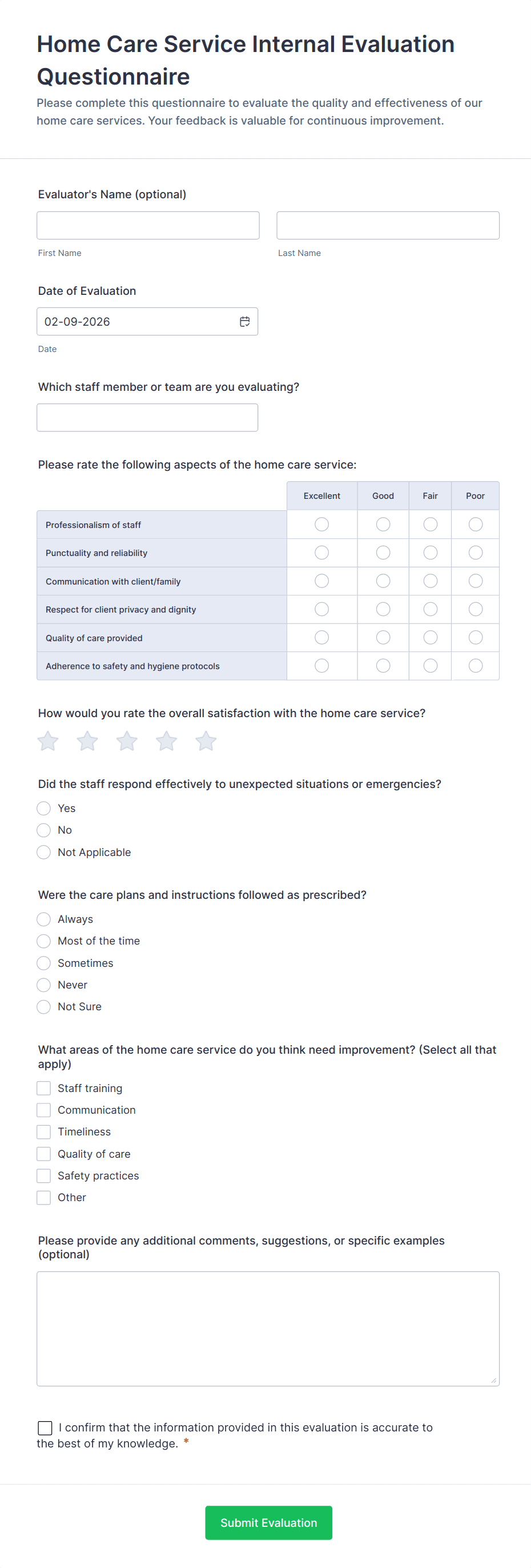 Questionnaire templates are pre-designed forms used to collect structured information from respondents for a variety of purposes, such as research, feedback, assessments, and evaluations. These templates can be tailored to suit different industries and objectives, including customer satisfaction surveys, employee engagement assessments, academic research, health screenings, and market research studies. By providing a consistent framework for gathering data, questionnaire templates help organizations and individuals streamline the process of collecting, analyzing, and acting on valuable insights.