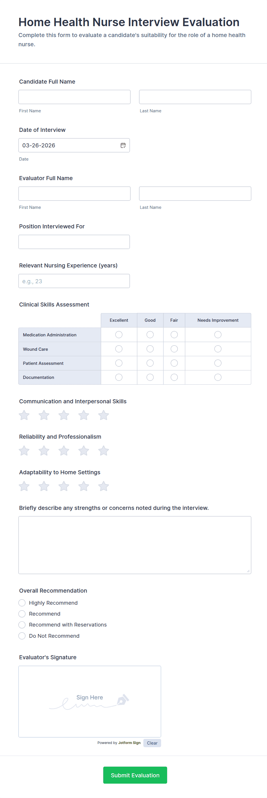 Need a quick but secure way to collect nursing information for your practice? Switch from paper forms to online forms and give your nurses a better way to gather health data from any device with our free Nurse Forms. Explore templates that make it easy to collect surveys, registrations, and evaluations, or to track medications, complete performance evaluations, and accomplish other internal tasks. All of our templates are fully customizable with our drag-and-drop builder, so you can get the look you want with no coding required! Jotform even offers an option to upgrade for HIPAA compliance features. Create a complete online database of all your nursing information with Jotform’s powerful Nurse Forms.