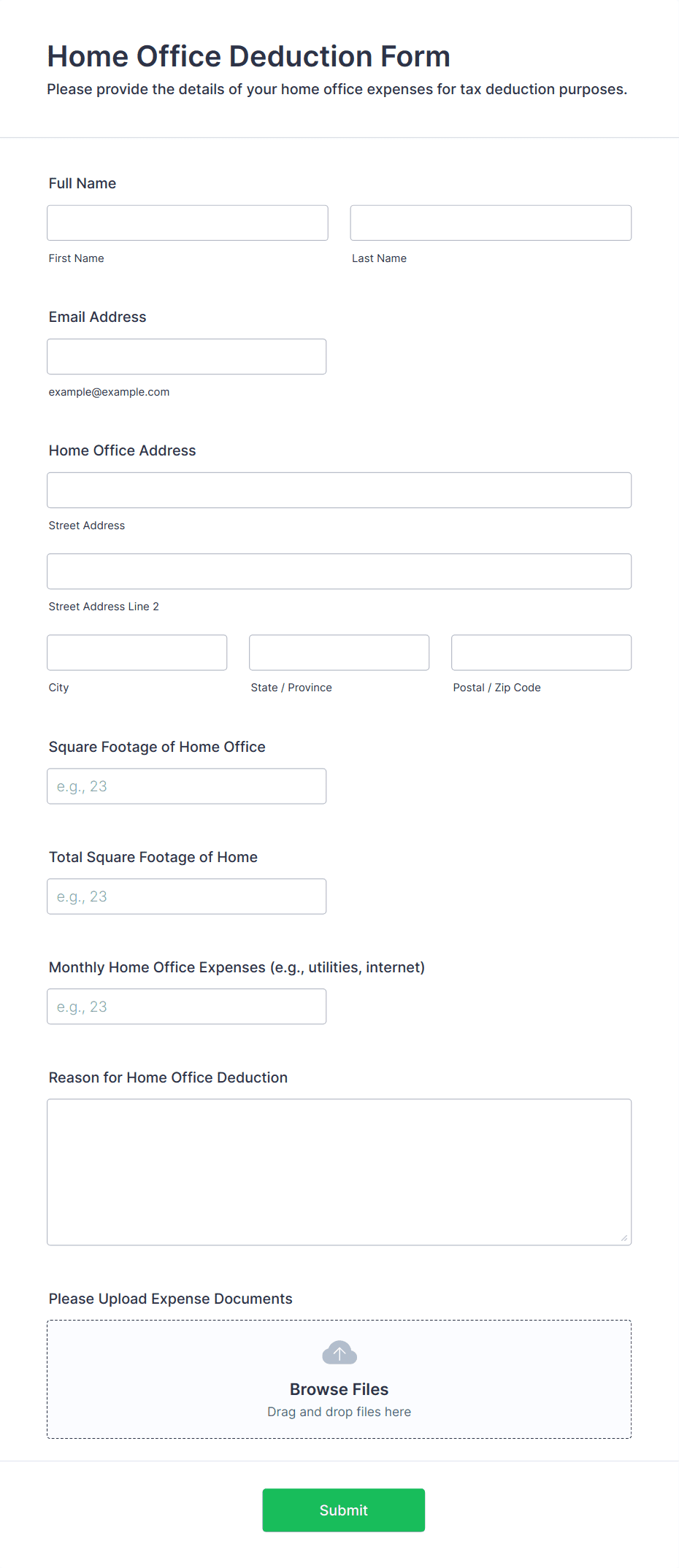 Common fields include personal or business identification details, tax identification numbers, income amounts, deductions, filing status, and supporting documentation such as receipts or invoices.