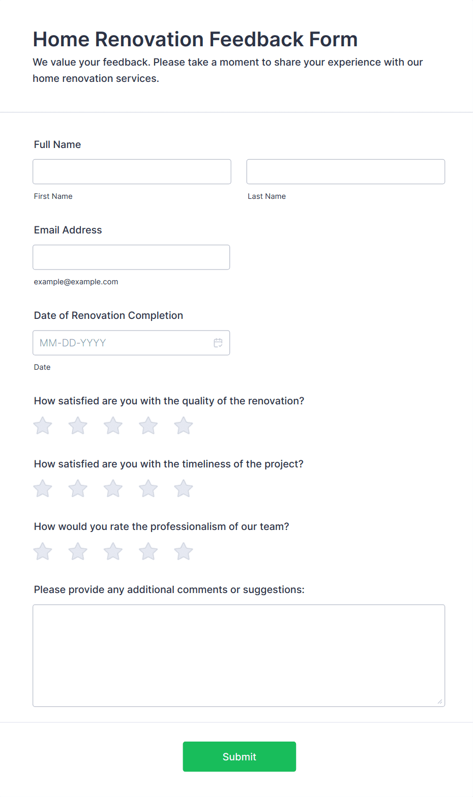 • Use the drag-and-drop Form Builder to add fields relevant to your feedback goals. Common elements include: