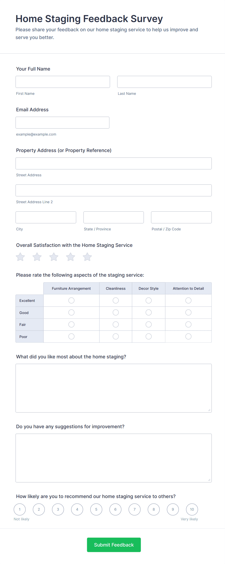 • For customer feedback, include questions about satisfaction, product quality, and likelihood to recommend.