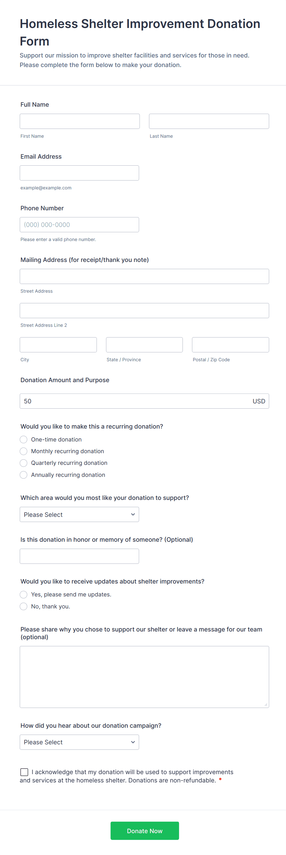 Donation forms are specialized online forms designed to collect contributions for charitable organizations, fundraising campaigns, nonprofit initiatives, and community projects. These forms streamline the process of gathering donor information, processing payments, and tracking contributions, making it easier for organizations to raise funds efficiently. Donation forms can be used for a variety of purposes, such as one-time or recurring donations, event sponsorships, crowdfunding efforts, membership drives, and emergency relief campaigns. They are essential tools for nonprofits, schools, religious groups, and community organizations seeking to engage supporters and facilitate secure, convenient giving.