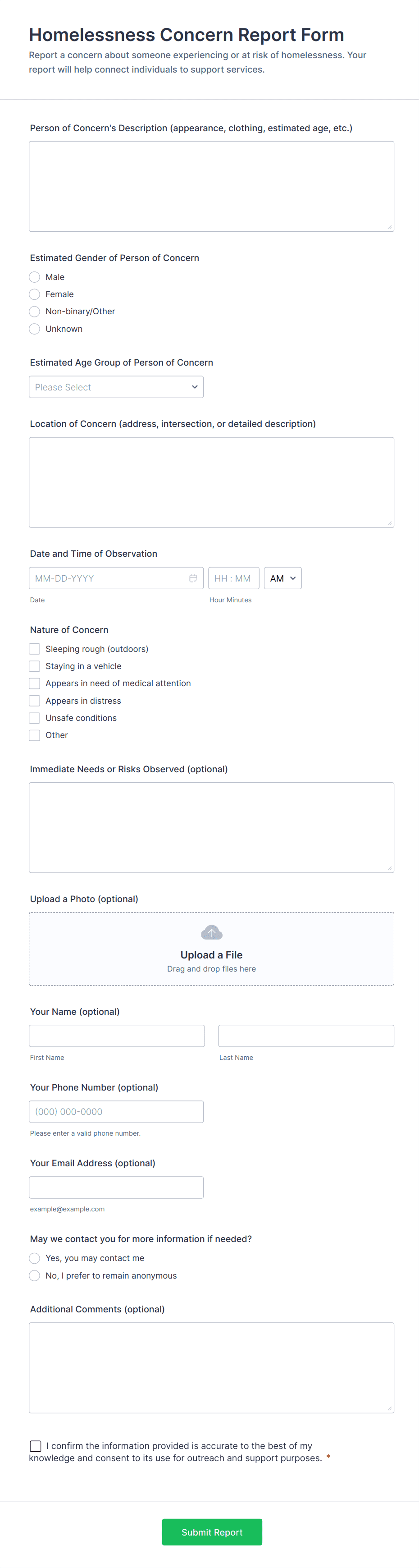 • For business reports: Include fields for dates, metrics, comments, and file uploads.