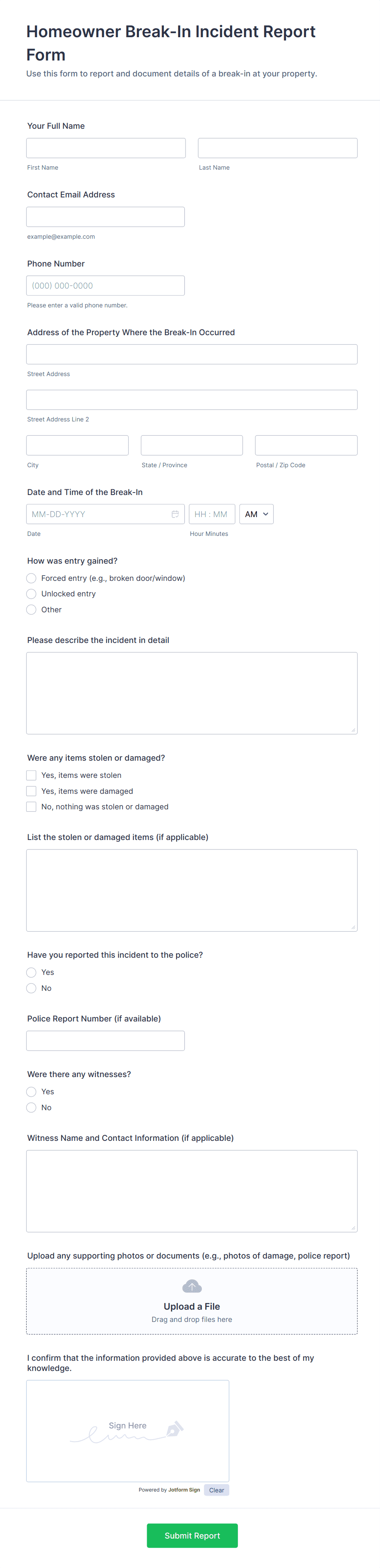 Customize your Incident Report Forms to suit your needs with Jotform’s intuitive no-code builder. Simply drag and drop to include your logo, add or update form fields, include checklist items, change fonts and colors, and more. Connect with our 100+ integrations such as Dropbox, OneDrive, or Airtable to automatically sync your submissions. Form responses are stored in your secure Jotform account and protected with a 256-bit SSL connection, CCPA compliance, PCI compliance, and optional HIPAA compliance.