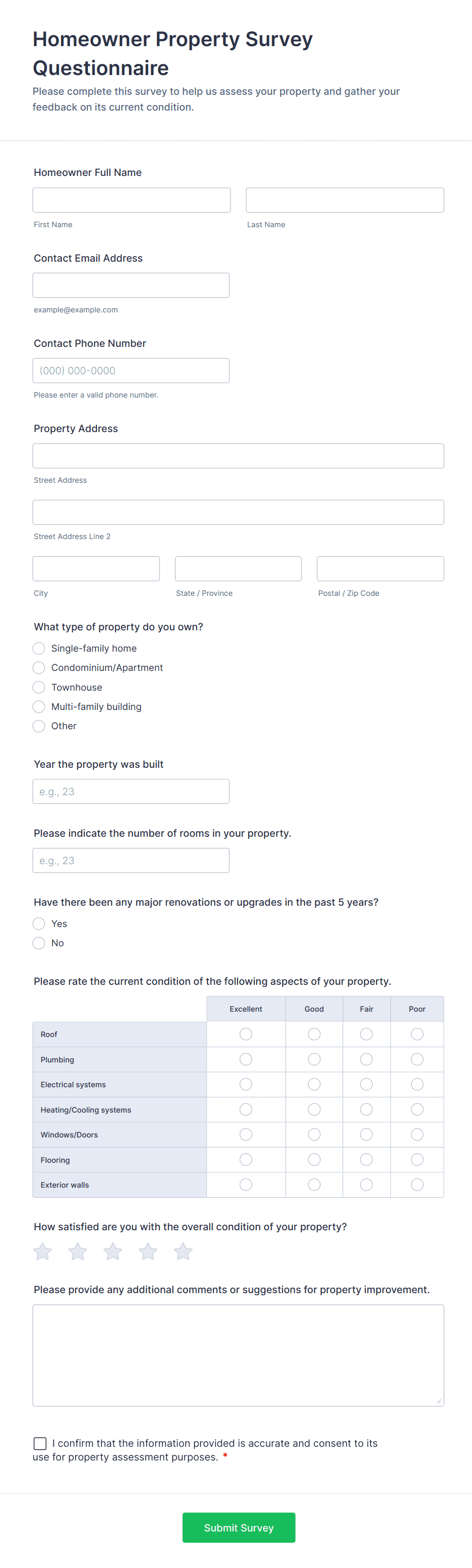 - Content and fields differ based on the objective: e.g., a health screening questionnaire may include medical history and symptom checklists, while a customer feedback form focuses on satisfaction ratings and open-ended comments.