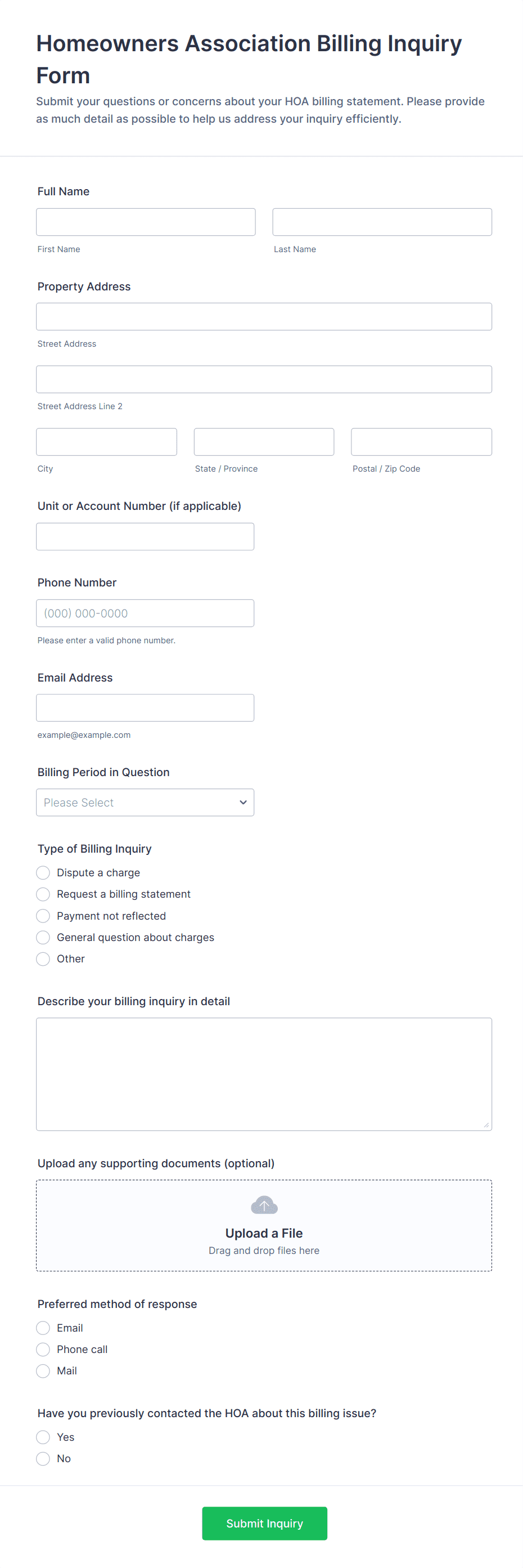 - HOA compliance and community reporting forms prioritize clear incident or violation description, dates, supporting evidence uploads, and structured routing for review or follow-up.
