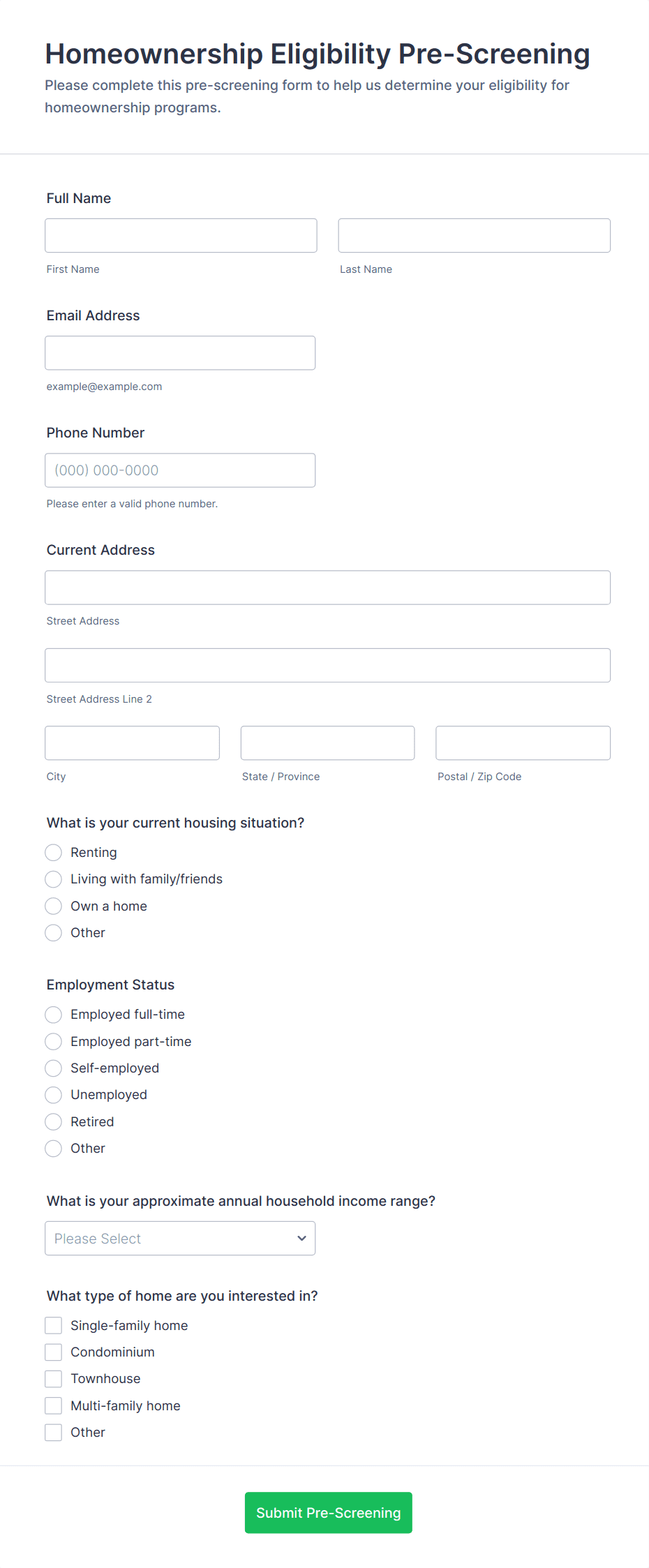 - File upload fields for supporting documents (e.g., pay stubs, tax returns, business plans)
