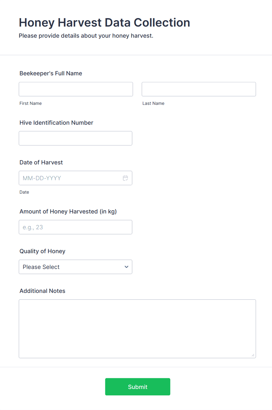 Collect and manage information for your farm with free online Farmer Forms. Whether you’re filling out land lease agreements, selling your products, or collecting worker applications, choose a template below and customize it to perfectly match your needs with our drag-and-drop builder. No coding required! You can then embed your form in your website, share it with a link, or fill it out yourself directly from your smartphone, tablet, or computer. Stop tracking information with pen and paper and upgrade to online Farmer Forms that work great on any device.