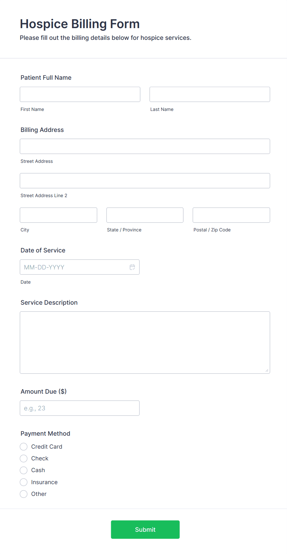 Make changes to any of our Hospice Forms with our intuitive form builder. No coding required — simply drag and drop to create additional forms and pages, install powerful widgets and integrations, upload your own branding, and more. You can even collect enrollment fees directly through your forms with our 30+ payment gateways — with no additional processing fees to Jotform. Share your forms with others by sending email invitations or by seamlessly embedding it in a website. Get the best care for your patient or loved one with these ready-made Hospice Forms that are compatible with any device.