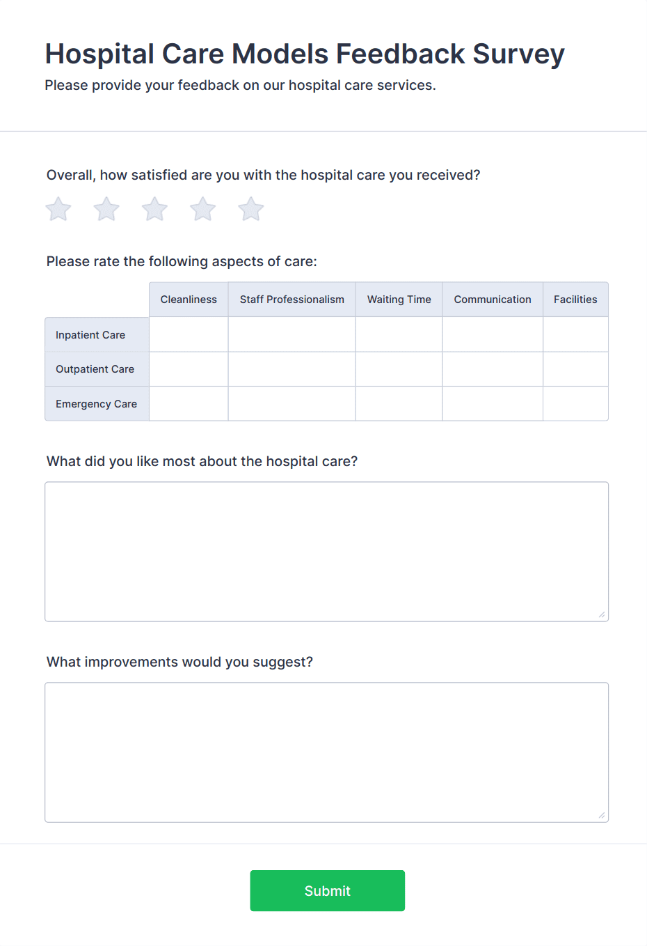 Healthcare surveys are specialized questionnaires designed to collect valuable information from patients, healthcare professionals, and other stakeholders within the medical field. These surveys can be used for a variety of purposes, such as assessing patient satisfaction, gathering feedback on healthcare services, monitoring public health trends, evaluating treatment outcomes, and conducting research studies. Healthcare organizations, clinics, hospitals, and research institutions rely on these surveys to improve patient care, streamline operations, and ensure compliance with industry standards.