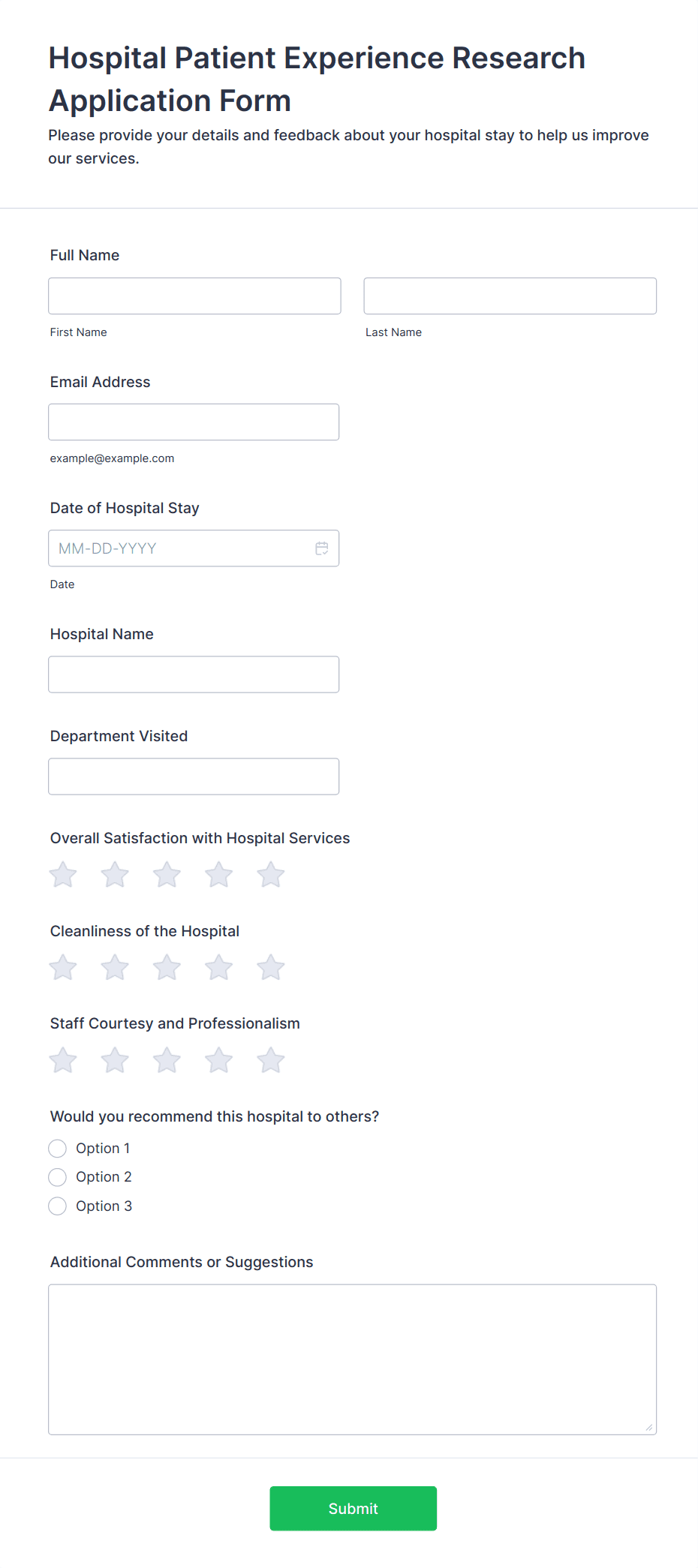 Medical surveys and questionnaires are essential tools used by healthcare professionals, researchers, clinics, and organizations to collect valuable information about patients’ health, medical histories, symptoms, treatment outcomes, and overall well-being. These forms can be used for a variety of purposes, such as patient intake, health risk assessments, satisfaction surveys, mental health screenings, post-visit feedback, and clinical research studies. By gathering structured data directly from patients or study participants, medical surveys and questionnaires help streamline workflows, improve patient care, and support evidence-based decision-making in healthcare settings.