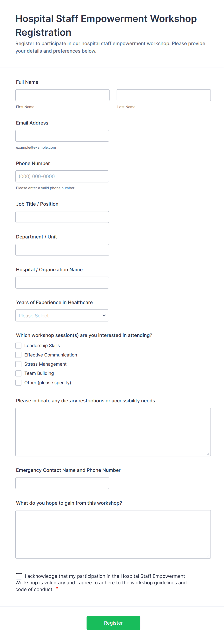Workshop Registration Form Templates are specialized online forms designed to streamline the process of enrolling participants in workshops, seminars, training sessions, and educational events. These templates help organizers efficiently collect essential attendee information such as names, contact details, session preferences, payment details, and special requirements. Whether you’re hosting a hands-on art class, a professional development seminar, or a multi-day technical workshop, these forms can be tailored to fit the unique needs of your event. Use cases range from small community workshops to large-scale industry conferences, making them versatile tools for educators, trainers, event planners, and organizations of all sizes.
