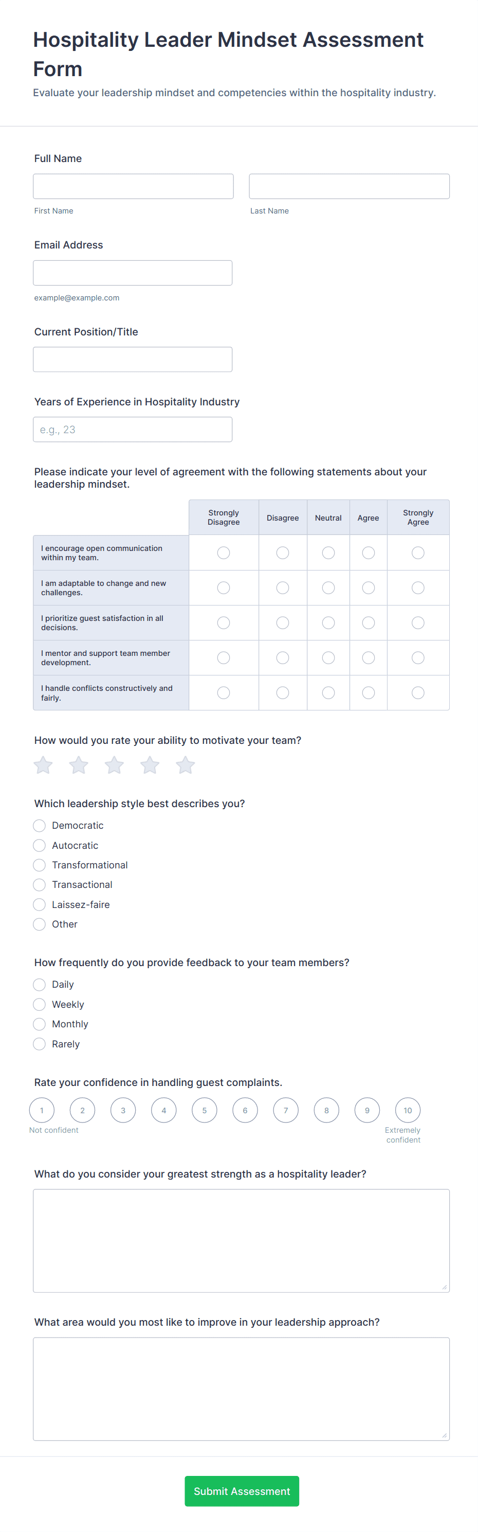 • Hospitality feedback and experience forms prioritize service quality ratings, staff interaction feedback, and open-ended guest comments.