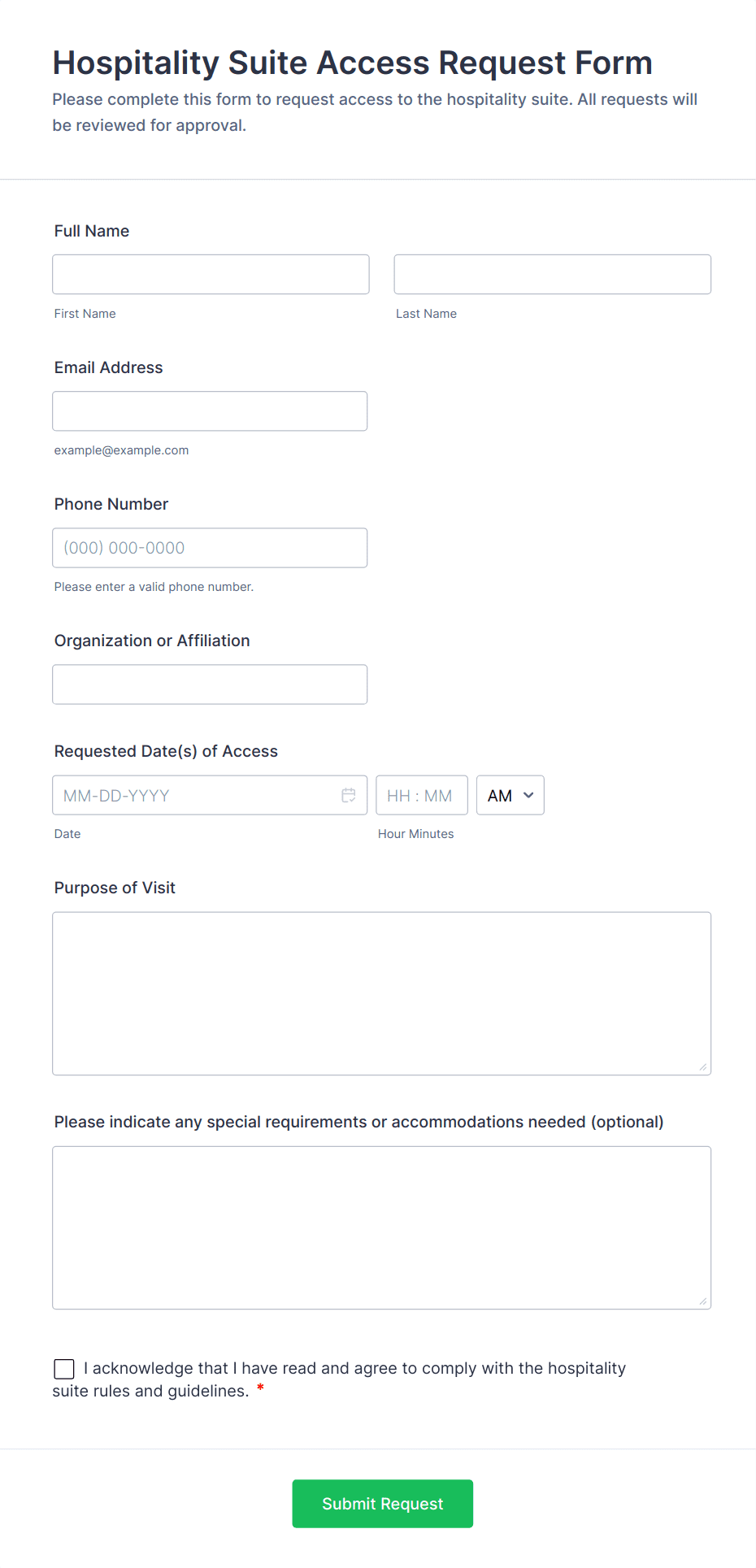 Collect requester name, department, contact info, and access type (physical, system, visitor). Include the reason for access and requested dates.