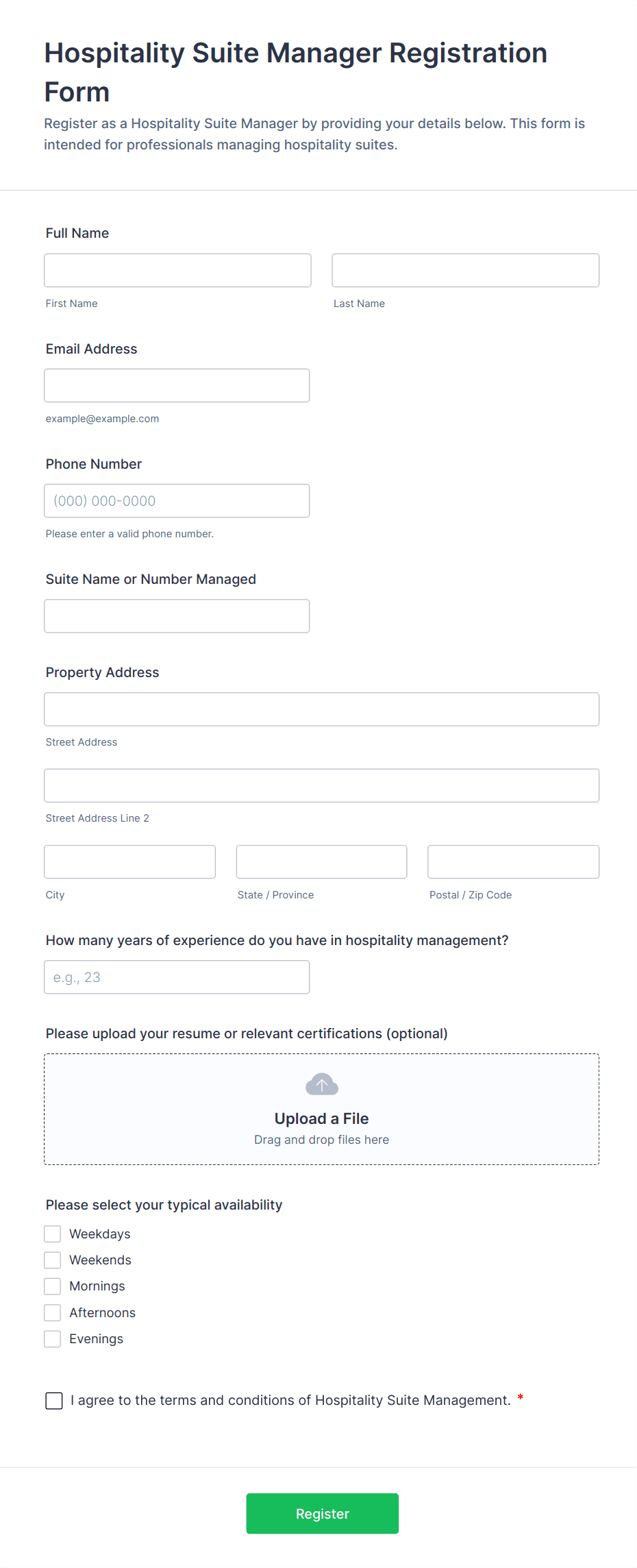 Hospitality forms are structured documents used to manage guest services, reservations, operations, and internal workflows in hospitality-focused environments. They help hotels, resorts, restaurants, venues, and service providers collect consistent information related to bookings, guest preferences, service requests, staff coordination, and operational reporting. Hospitality forms are commonly used for room and table reservations, guest check-ins, special requests, event bookings, feedback collection, and internal service coordination. By standardizing these processes, hospitality forms improve guest experience, reduce operational friction, and help teams deliver consistent service.
