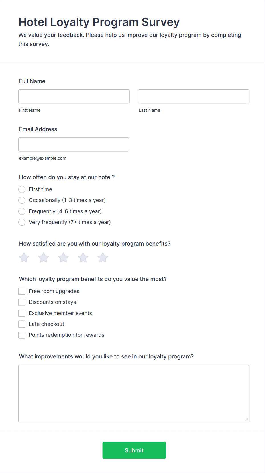 A Website Survey is a form template designed to collect visitors' feedback effortlessly. It's perfect for website owners or developers seeking to improve user experience and site functionalities. This intuitive tool saves time, aids in decision-making and enhances customer satisfaction.