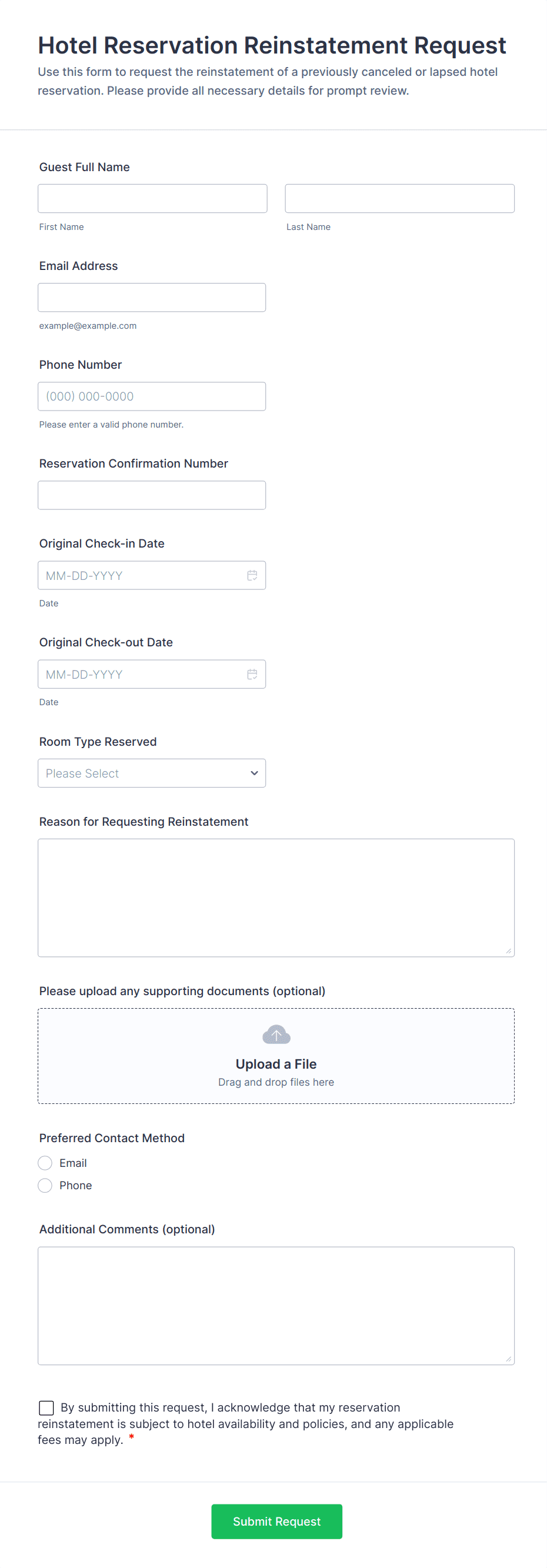 Reservation forms are useful for businesses and organizations of all sizes, including restaurants, hotels, clinics, event venues, rental services, and educational institutions.