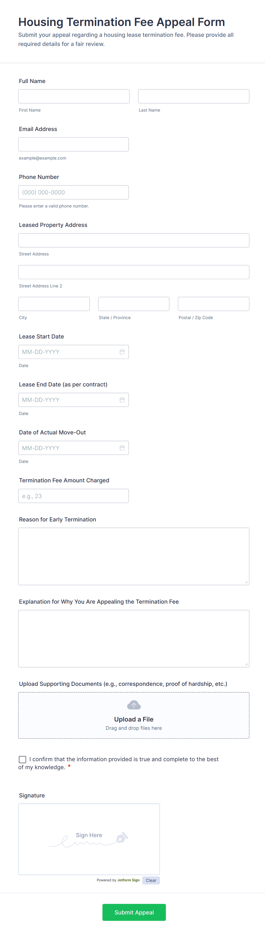 The form templates here are for informational purposes only. Jotform is not providing legal, financial, or other advice, or implying that the forms are legally valid in all or any jurisdictions. Before using any such form, consult an attorney and/or other applicable professionals to make sure that the form meets your needs, legally and otherwise.
