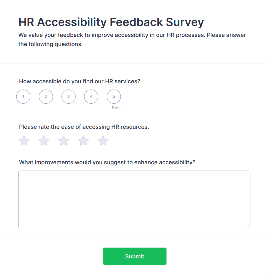 A Human Resources Survey is a structured questionnaire used by HR departments to collect feedback, opinions, and data from employees or job candidates on various workplace topics such as satisfaction, training, onboarding, and company culture.