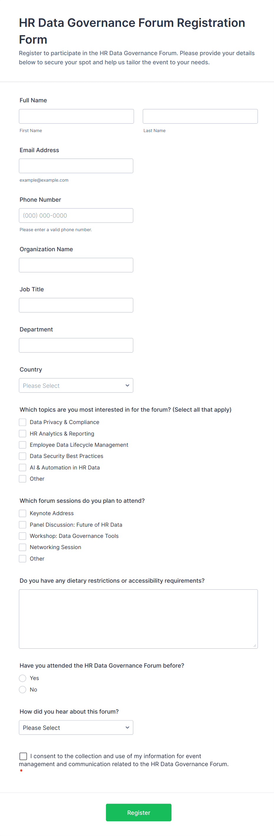 - Session or Workshop Selection (dropdowns or checkboxes)