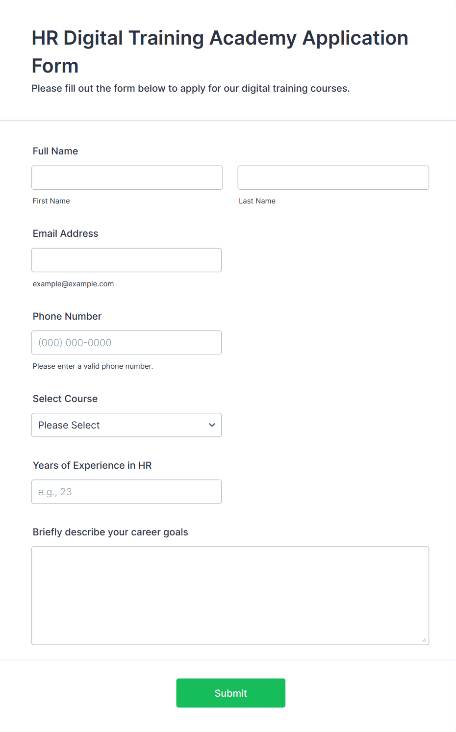 Training forms are specialized digital documents designed to streamline the process of organizing, managing, and evaluating training programs. These forms can be used for a variety of purposes, such as employee onboarding, skills assessments, training feedback, course registrations, pre-training surveys, and post-training evaluations. Organizations of all sizes — from corporate HR departments to educational institutions and training consultants — rely on training forms to collect essential information, track participant progress, and ensure that learning objectives are met efficiently.