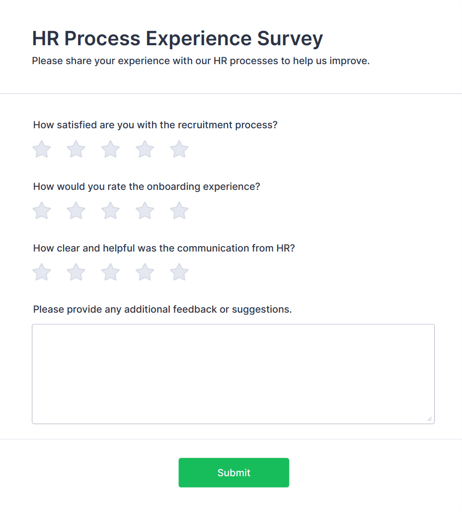 • For onboarding or exit surveys, add fields about the hiring process, training, or reasons for leaving.