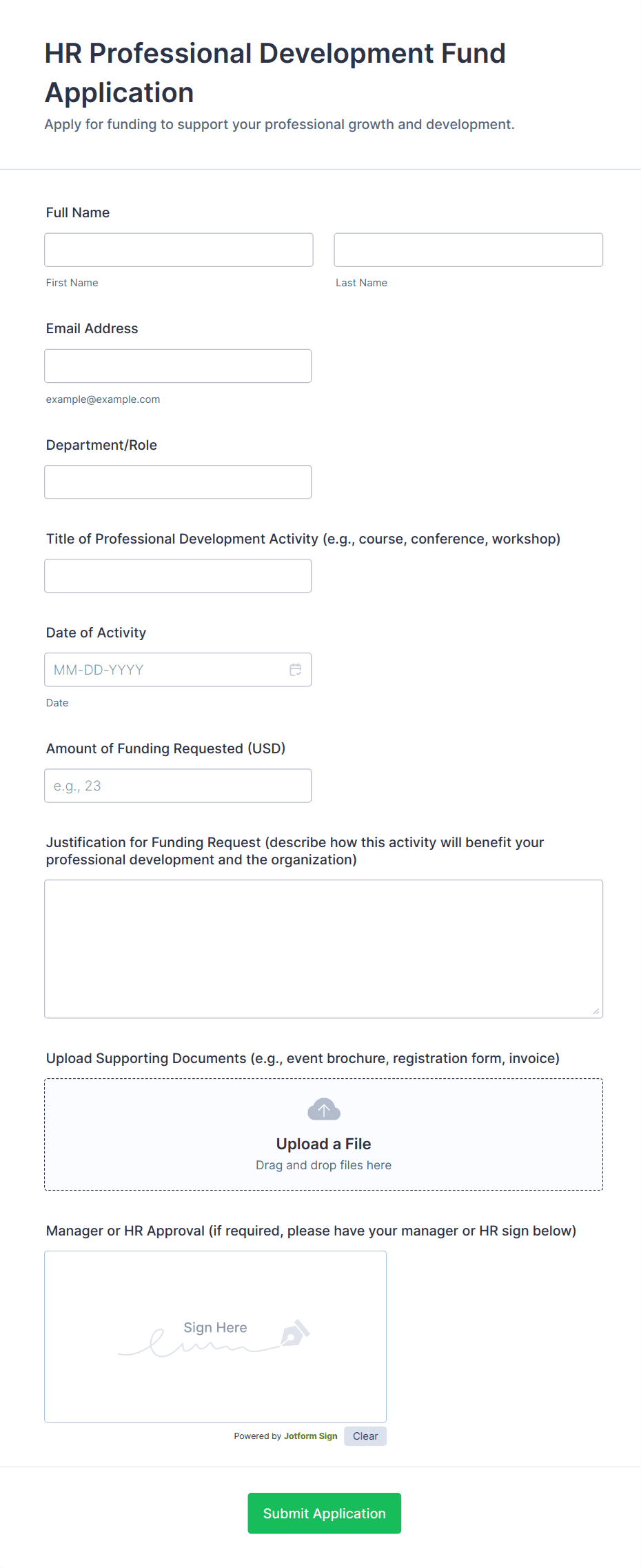 Human resources forms are documents that a company's HR department uses to recruit and manage employees. With Jotform’s online human resources form templates, your HR department can manage employee information, employment verification, employment satisfaction, CV submissions, job applications, and time-off requests. Get started by choosing a template below to edit for free.