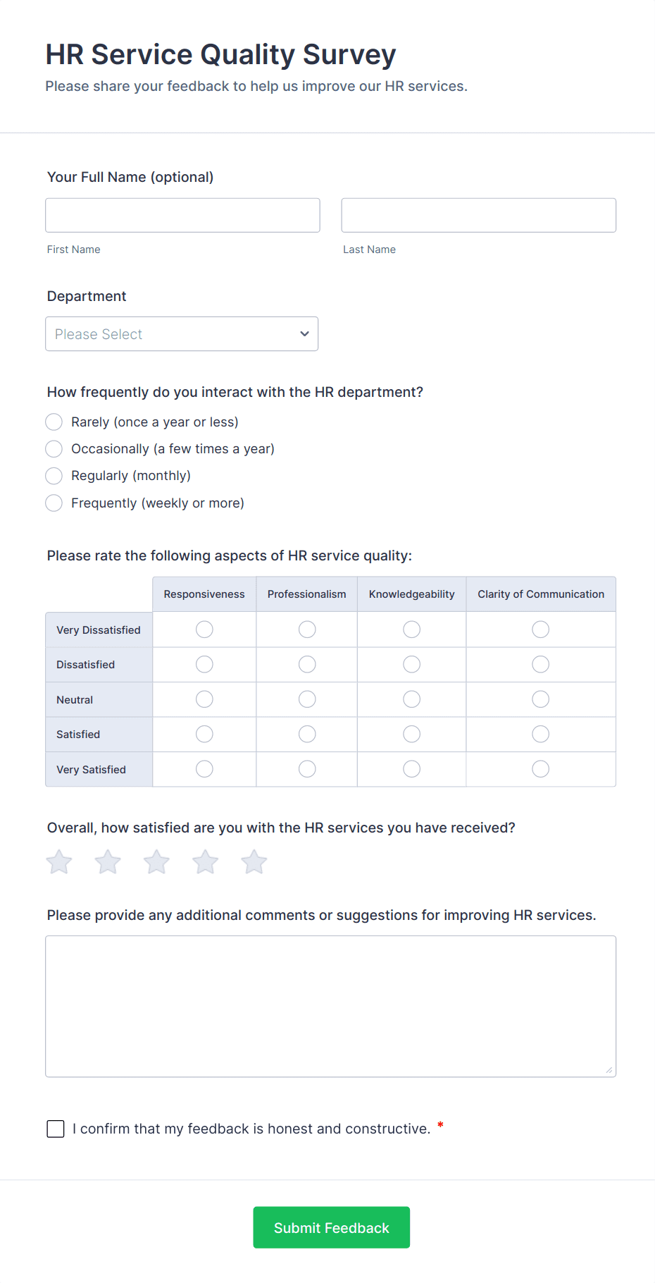 A Human Resources Survey is a structured questionnaire used by HR departments to collect feedback, opinions, and data from employees or job candidates on various workplace topics such as satisfaction, training, onboarding, and company culture.
