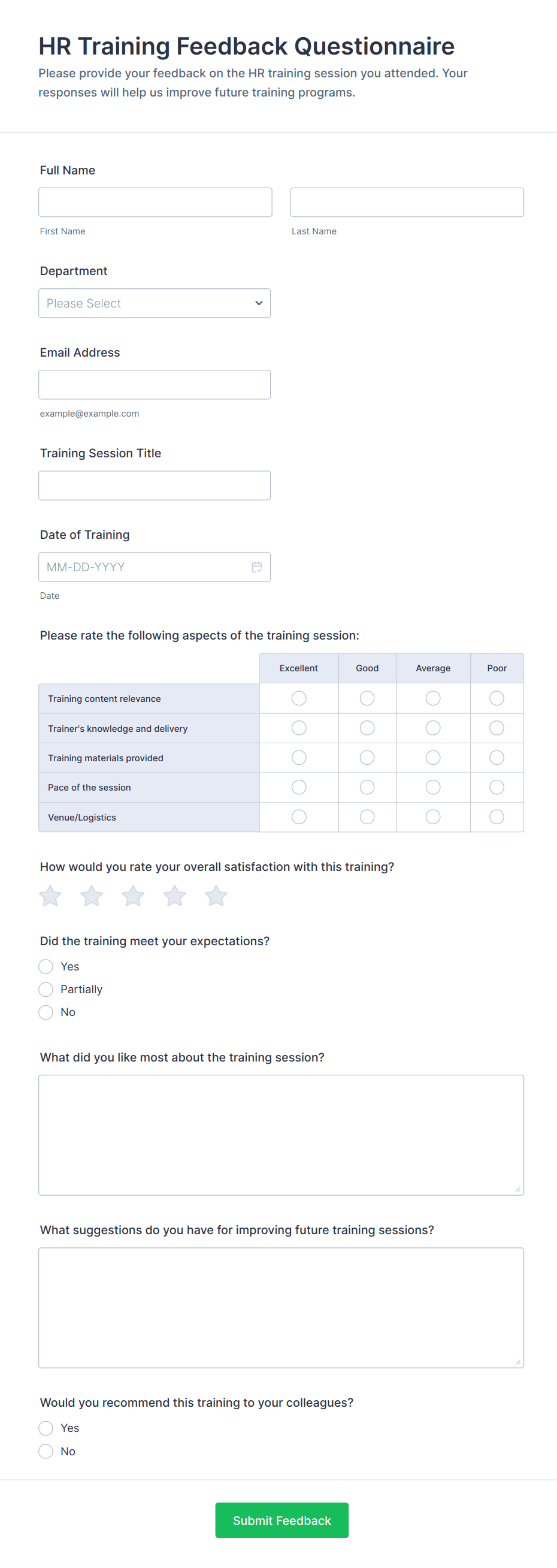 Collect training name, session date, trainer name, department, and participant role so results can be segmented.