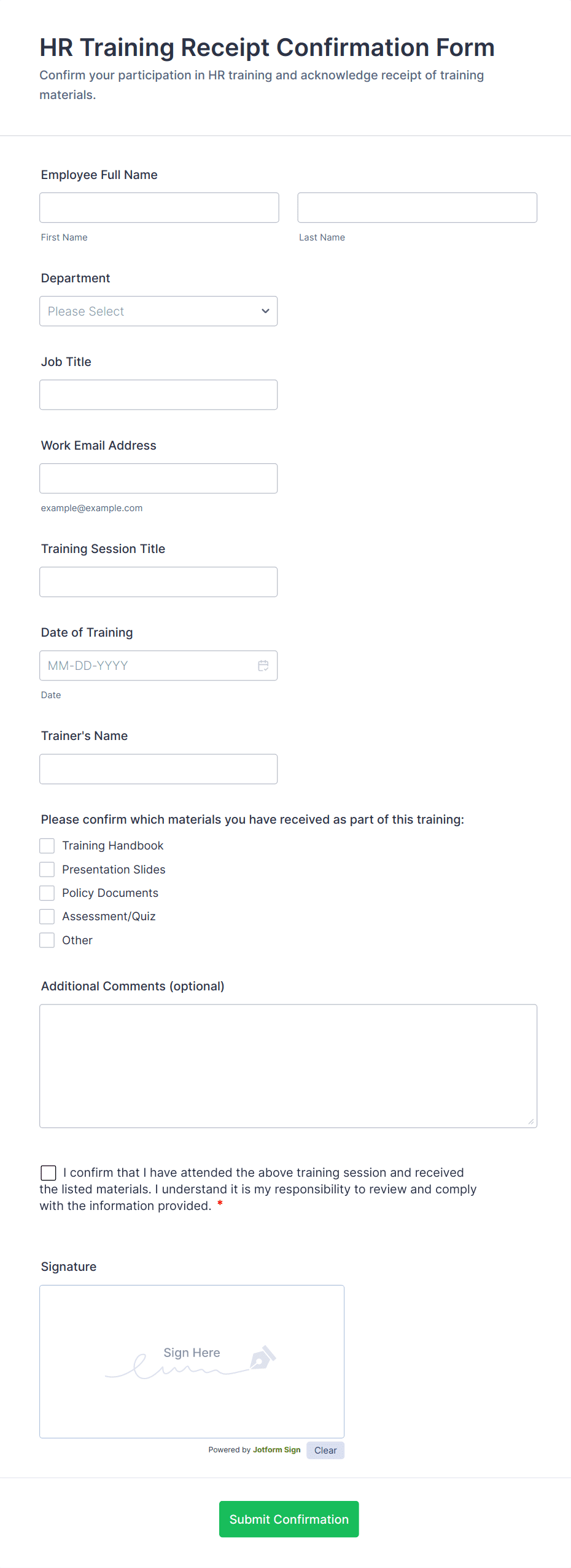Training forms are specialized digital documents designed to streamline the process of organizing, managing, and evaluating training programs. These forms can be used for a variety of purposes, such as employee onboarding, skills assessments, training feedback, course registrations, pre-training surveys, and post-training evaluations. Organizations of all sizes — from corporate HR departments to educational institutions and training consultants — rely on training forms to collect essential information, track participant progress, and ensure that learning objectives are met efficiently.