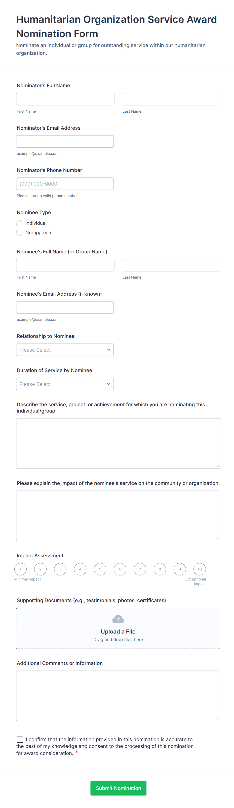 Community Service Award Nomination Form Template for nonprofits, schools, and community groups to collect nominations online, organize form submission details, and support consistent award review using Jotform Form Templates.