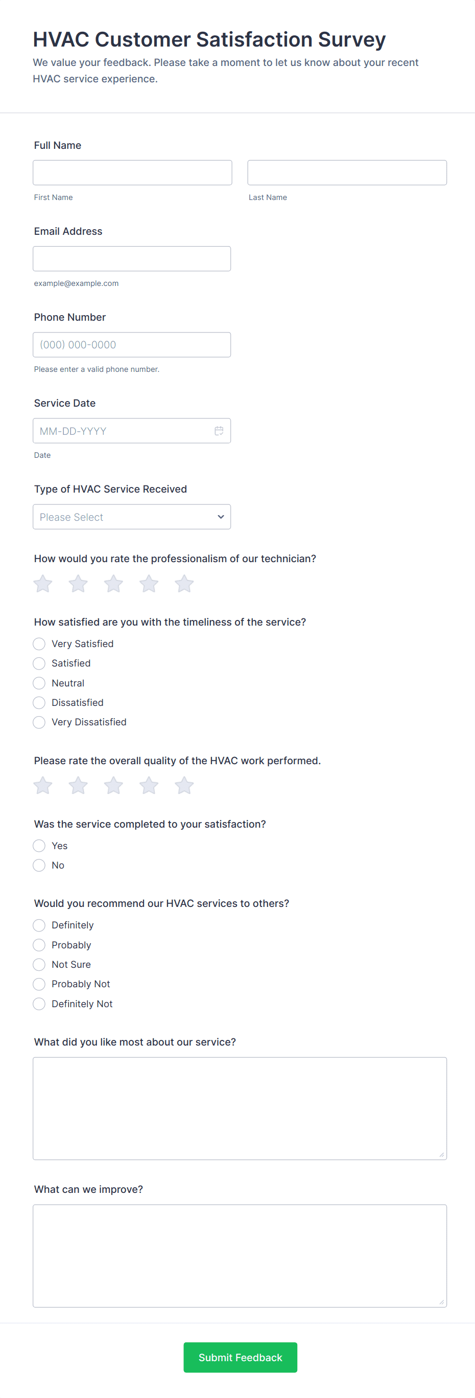Service Feedback Forms are specialized tools designed to collect valuable insights from customers, clients, or stakeholders about their experiences with a particular service. These forms are commonly used by businesses, healthcare providers, educational institutions, and service-based organizations to gather feedback on service quality, staff performance, response times, and overall satisfaction. By using Service Feedback Forms, organizations can identify strengths, uncover areas for improvement, and make data-driven decisions to enhance their offerings. Typical use cases include post-service surveys, customer satisfaction assessments, complaint resolution follow-ups, and ongoing quality monitoring.