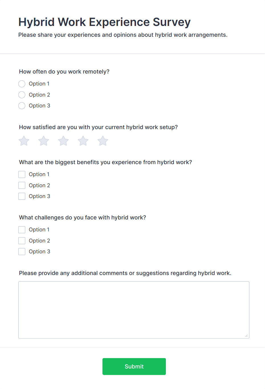 Analyze your current work from home policy with a free online Remote Work Survey. Ideal for coronavirus-related remote workplaces. Sync responses to 100+ apps.